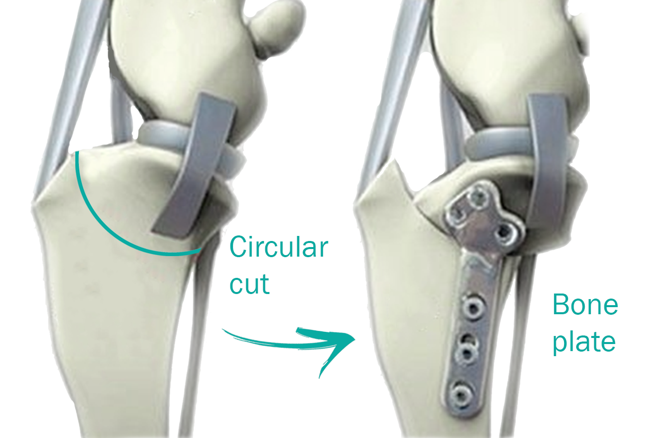 Bu ameliyat, tibianın üst kısmında dairesel bir kesi oluşturulmasını ve kemikteki önceki eğim artık mevcut olmayana kadar plato segmentinin döndürülmesini içerir. Daha sonra kemik, kemik plakası ve vidalar kullanılarak bu yeni pozisyonda sabitlenir. Böylece femurun tibia üzerinde uygunsuz şekilde kayması engellenmiş olur. Hassas ölçümler ve kusursuz el maniplasyonu gerektirdiği için tecrübeli ve ehil cerrahlar tarafından uygulanmalıdır.
